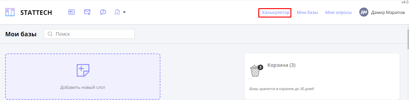Для того, чтобы зайти в калькулятор для расчёта объема выборки необходимо нажать в правом верхнем углу кнопку «Калькулятор» (Рис. 1).