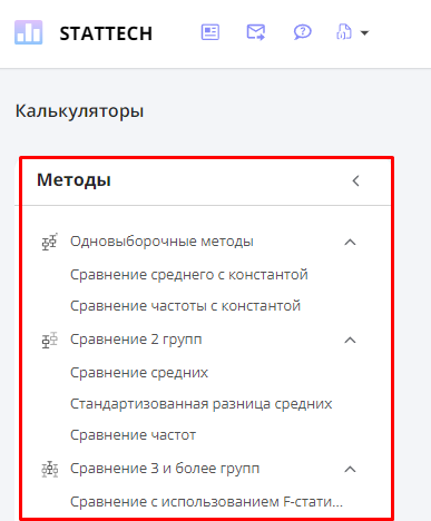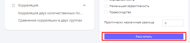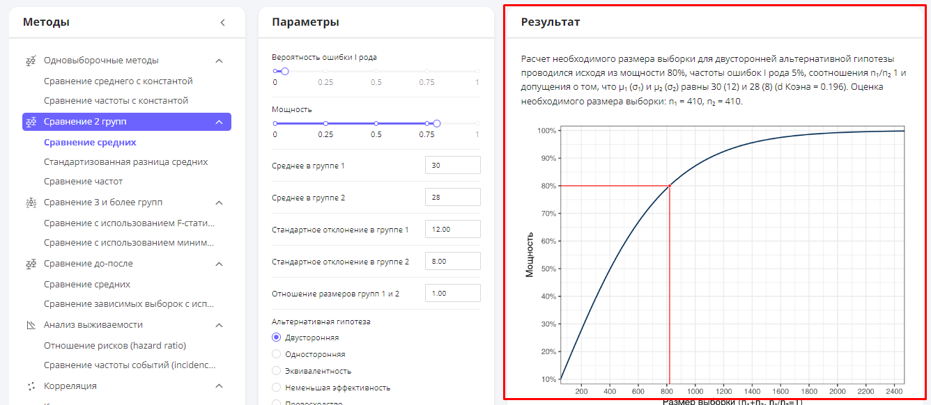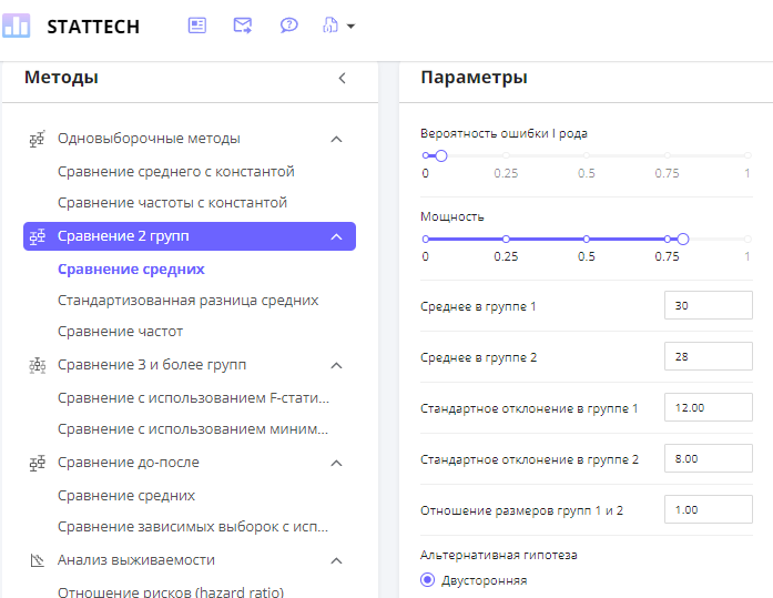 Выбираем необходимый метод расчета выборки, например, сравнение 2х групп, кликнув левой кнопкой мыши по методу. После этого откроется окно с параметрами, где необходимо заполнить данные для калькулятора (Рис. 3).